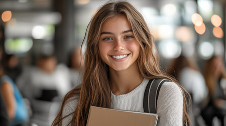Portrait of smiling female student with group of friends standing in the background