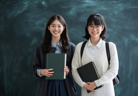 Two young women are smiling and holding books. They are dressed in school uniforms and appear to be happy