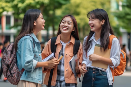 Generative AI : Three of asian student college are walking and talking on the way to classroom in the campus university Education lifestyle concept