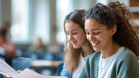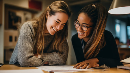 Two young women, full of joy, are deeply engaged in studying together with books and a laptop