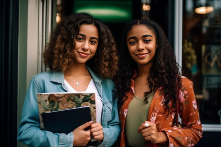 Teen girls laugh and chat outside school, candid moment, multicultural and casual energy