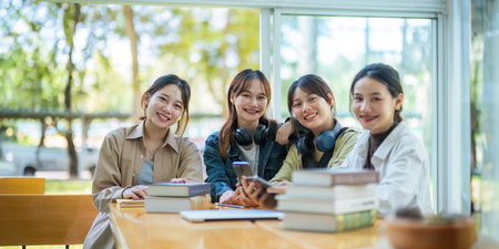 Shot of student groups are viewing information in books and laptops. Willing to study together.