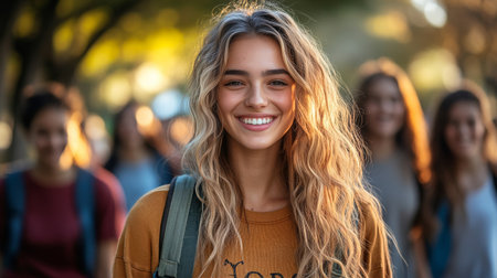 A young woman with long, wavy hair smiles brightly while walking in a park at sunset. Friends are seen in the background, enjoying the warm evening light and cheerful atmosphere.