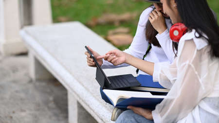 Cropped shot of two female college students using computer tablet learning and preparing for exam.