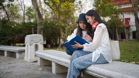 Two asian college students studying together in the campus.