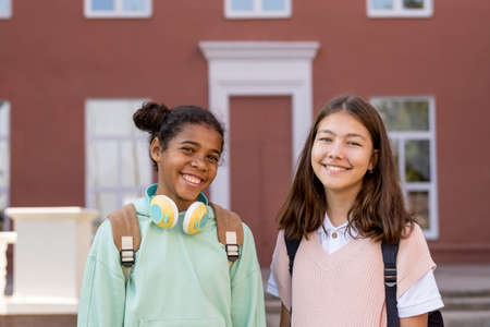 Two cheerful girls in pullovers looking at you with toothy smiles against exterior of school building