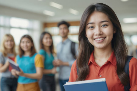 Portrait of happy student Asian girl holding book and looking at the camera in library in college. A group of young people students are smiling and holding books