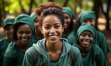 A group of women wearing green hoodies smile happily in a group.