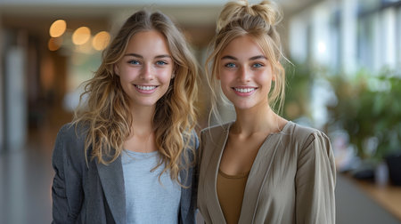 Two businesswomen in an office, one in a suit and the other in casual attire, smiling at camera