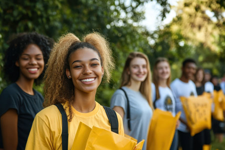 Group of enthusiastic volunteers gather in a park, holding cleanup supplies and ready to make a difference.