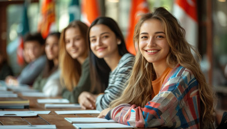 A vibrant group of students from various backgrounds collaborated in an English class, enriched by cultural flags.