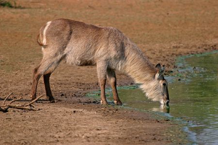 Male Waterbuck at a waterhole in the Kruger National Park, South Africa.