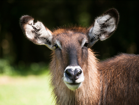 Close-up facial of a Waterbuck ( Kobus ellipsiprymnus) looking directly at the camera in the Kruger National Park of South Africa.
