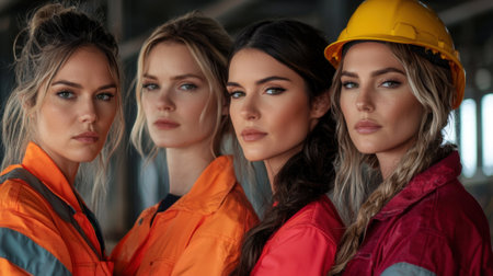 Four women dressed in vibrant work attire, including safety helmets, pose together on a construction site. The setting showcases urban industrial elements in the background.