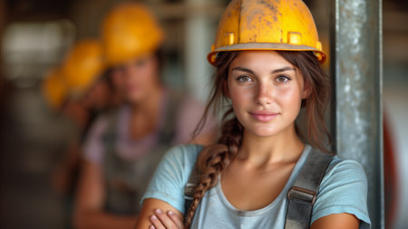 Portrait of a young, empowered female construction worker wearing a yellow safety helmet, exuding confidence in an industrial setting.