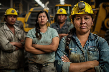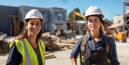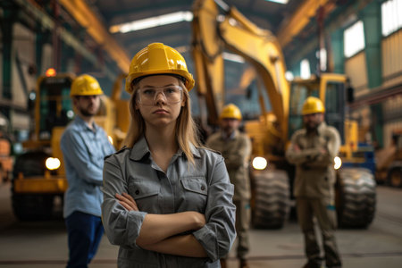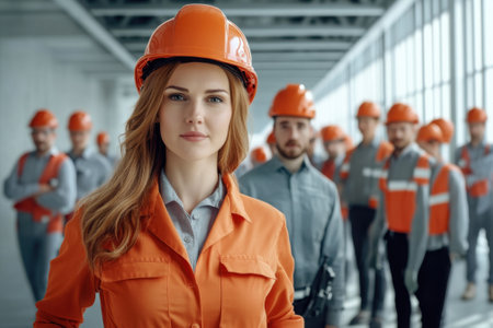 Young female cement worker leads her team at a lively construction site during daylight hours