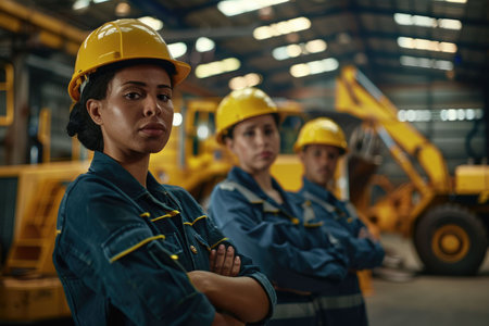 Female workers in hard hats transporting heavy equipment in an industrial setting, AI Generated