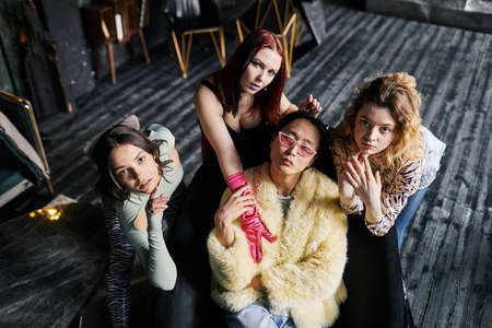 High angle portrait of posh vogue dance crew with Asian male leader, all looking at camera
