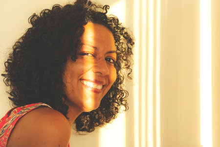 Young smiling beautiful curly woman at home