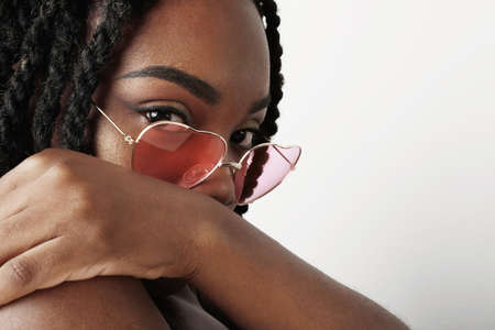 Close-up portrait of black attractive woman, posing over white background. Skin care concept.