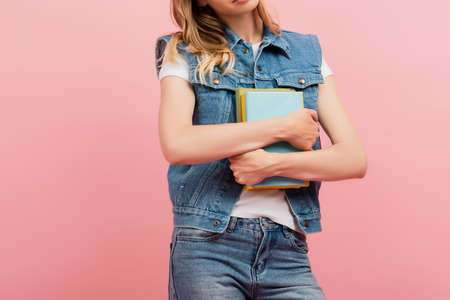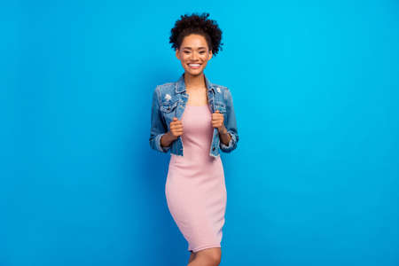 Photo of cheerful attractive happy young woman hold hand denim jacket wear isolated on blue color background
