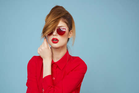 Woman in red shirt on blue background holds hands near face and sunglasses red lips makeup model