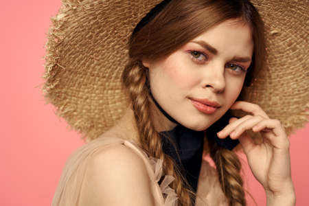 Portrait of a girl in a straw hat on a pink background emotions close-up beautiful face model pigtails
