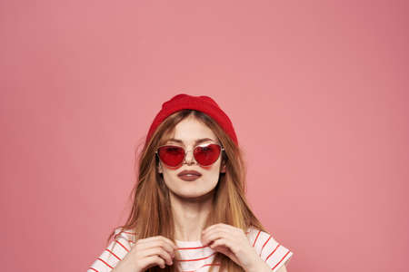 Beautiful fashionable woman in red hat with sunglasses Studio