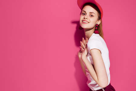 pretty woman in summer clothes with a cap on her head fashion fun pink background