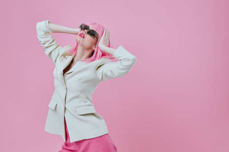 Portrait of a charming lady modern style pink hair sunglasses pink background unaltered