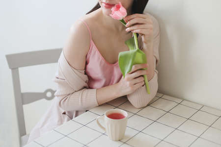 sexy brunette lady is sitting alone in bedroom at evening, closeup portrait