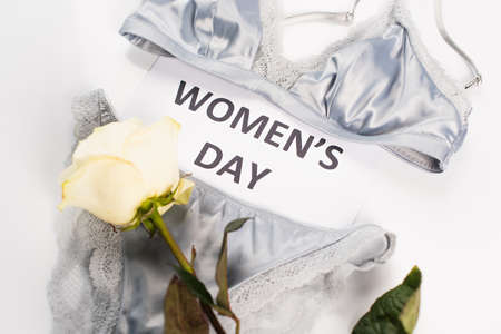 Female summer outfit and roses on white. Fashion, elegance and minimal concept. Flat lay romantic style look, top view