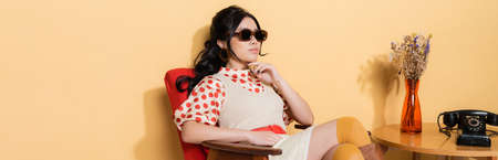 Stylish asian woman in sunglasses sitting on armchair near telephone on coffee table on orange background, banner