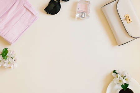 A flat lay frame made of women's clothing, bags, toilet water, sunglasses on a beige background with a copy space. Blogger's workplace