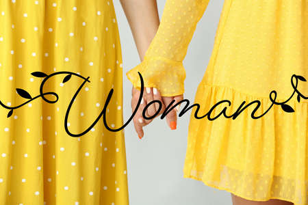 Beautiful young women holding hands on light background, closeup. Concept of femininity