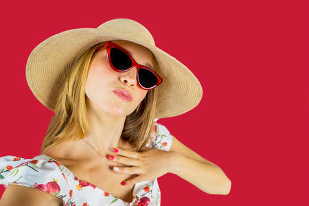 Portrait of beautiful young woman blowing her lips sending sweet air kiss posing wearing a summer straw hat, dress on blue background