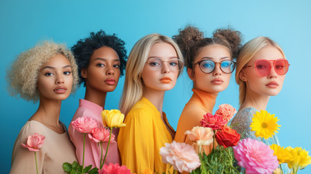 Five diverse models holding colorful flowers celebrating international women's day with a bright blue background. Ai generated