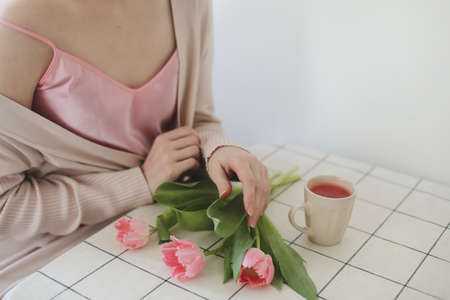 romantic spring portrait of a young woman with tulips at home.