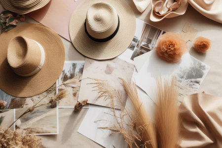 This visually appealing arrangement features an elegant summer dress, stylish sunglasses, and dried flowers, creating an inspiring fashion and lifestyle composition for seasonal imagery.