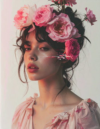 A young Asian woman with a soft expression gazes thoughtfully while holding a bouquet of delicate pink roses and dried flowers. The gentle colors and her serene demeanor evoke a sense of calm and beauty, celebrating the elegance of nature and femininity.