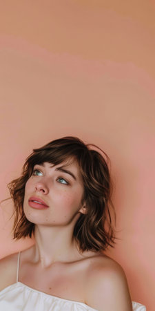 A young woman with soft features and flowing hair gazes thoughtfully upwards against a calming green backdrop. Her expression radiates tranquility and introspection, inviting viewers to share in her moment of reflection.