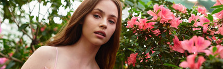 In a sunny greenhouse, a beautiful young woman enjoys the vibrant flowers and fresh plants.