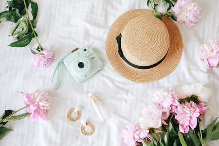 Pink handbag, camera, makeup brushes, cosmetics, sunglasses, accessories on white background. Flat composition. social media. Top view. Flat lay.