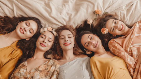 Girls from the top Close up top view of four young women in pajamas lying on the bed : Generative AI