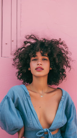 Generate a portrait of a woman with curly hair, wearing a blue blouse, and standing in front of a pink wall.