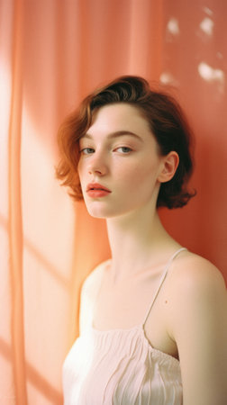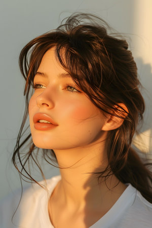 A serene young woman with short dark hair and natural makeup, illuminated by soft sunlight, casting beautiful shadows on her face, embodying calmness and beauty