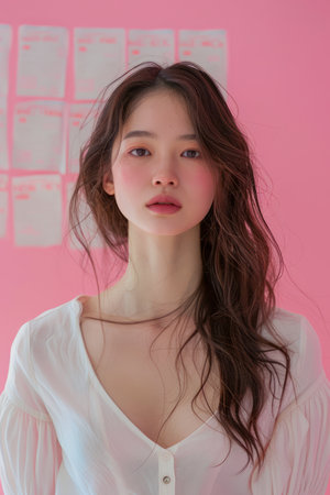 Elegant Young Woman in White Blouse with a Thoughtful Expression Against Pink Background AI Generative