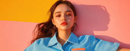The image showcases a vibrant, shirt-like garment with an orange patch, not a bohemian denim playsuit A woman models the bright attire against an abstract mural of pink and yellow, illuminated by strong lighting The focus is on her fashionable look, complete with bold makeup and a saturated lip color, AI Generative
