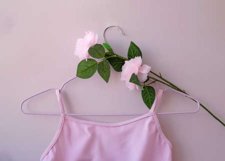 A pink tank top with thin straps hangs on a pink hanger with a pink rose