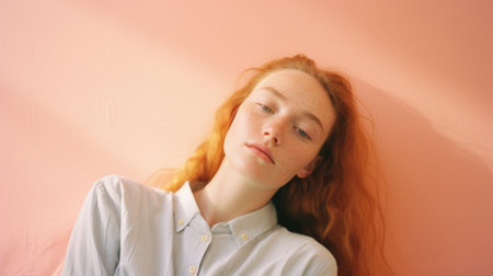 A young woman's playful spirit is accentuated by her whimsical freckles and a billowing white top against a pink backdrop